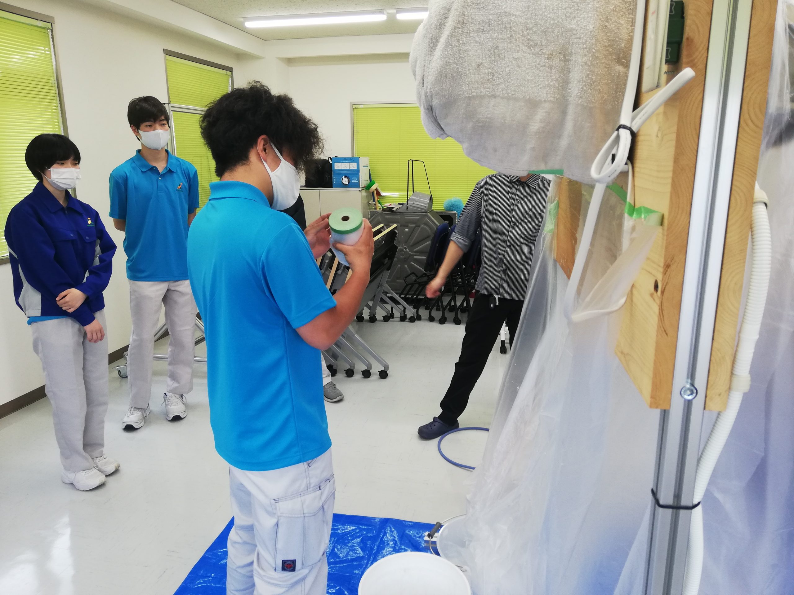 エアコンの各部パーツの名称や冷却・暖房の仕組みなどを座学で学びました。午後からは水や薬品を大量に使うのが特徴であるエアコン清掃において欠かせない「養生」を実践しました。