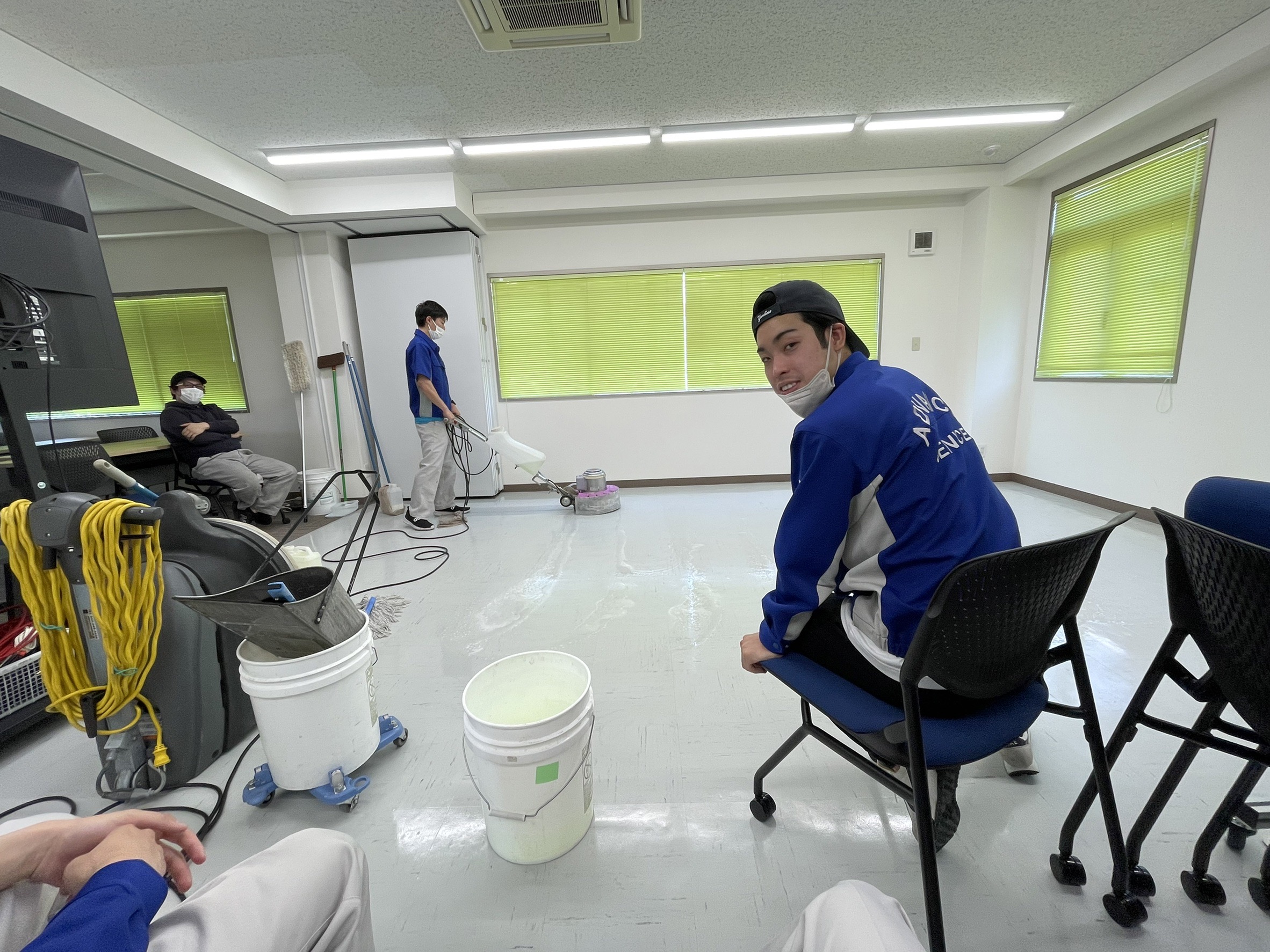 最初は僕とウッズが教えてもらっていたのですが、途中からジョージやチップも参加し、床清掃のタイムを測ったりして、とても楽しかったです!チップのポリッシャーさばきはさすがでした!!
