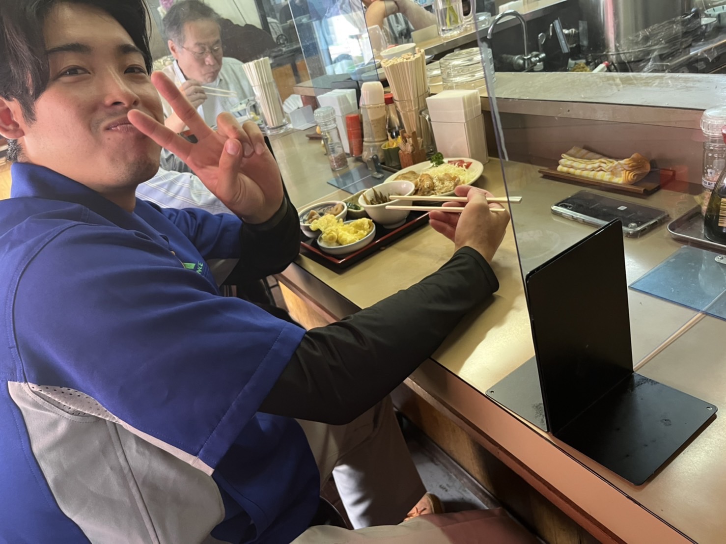 先日ロンさんと一緒に、事務所近くの定食屋さんに行きました!