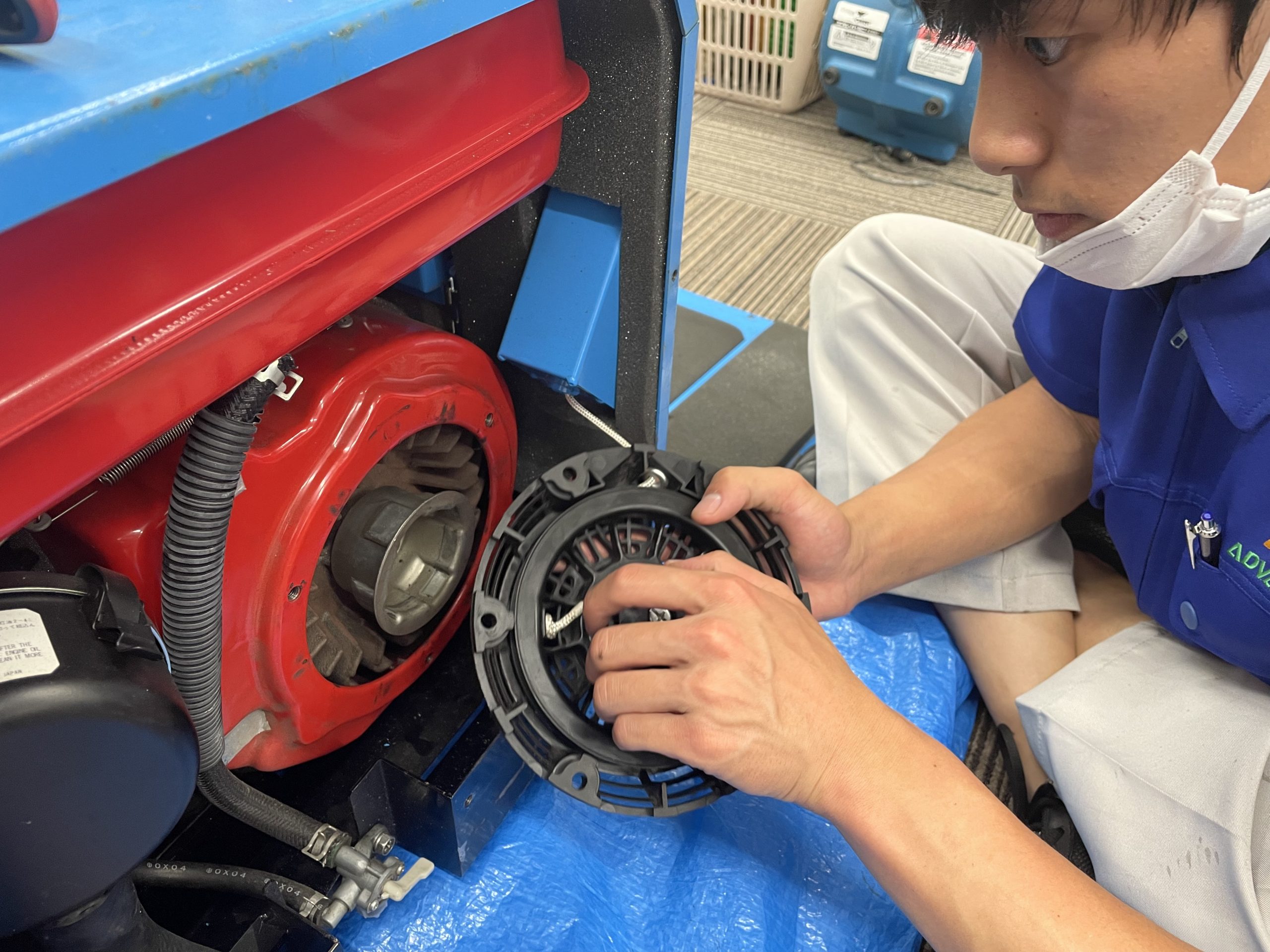 本日、日常清掃の現場終わりに高圧洗浄機の紐を交換しました!交換の際、外さなくてもいい所を外してしまい焦りましたが、なんとか交換できて良かったです!オイル交換も教わったので、紐と同様定期的にメンテナンスをしていき、道具を大切に使用します!