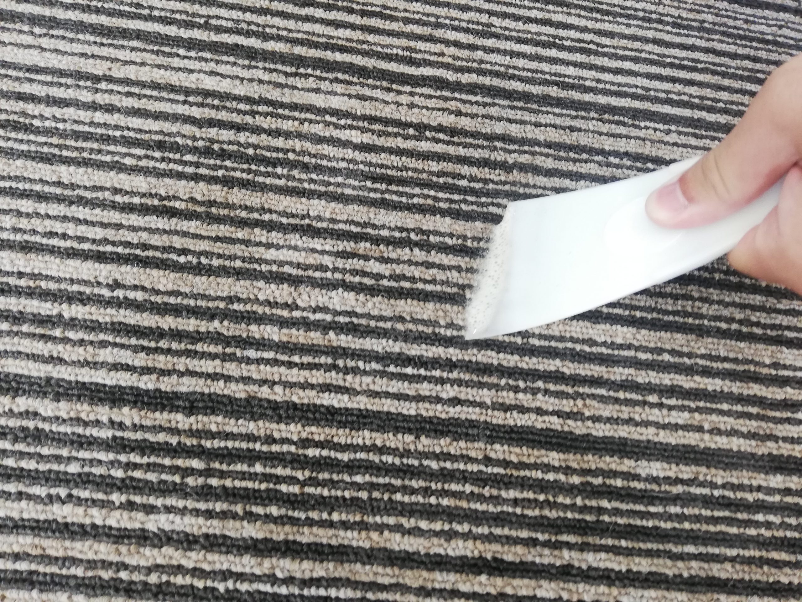 写真はスクレーパーという道具で、カーペットのシミを洗浄液と一緒に浮かせて取り除いているところです!