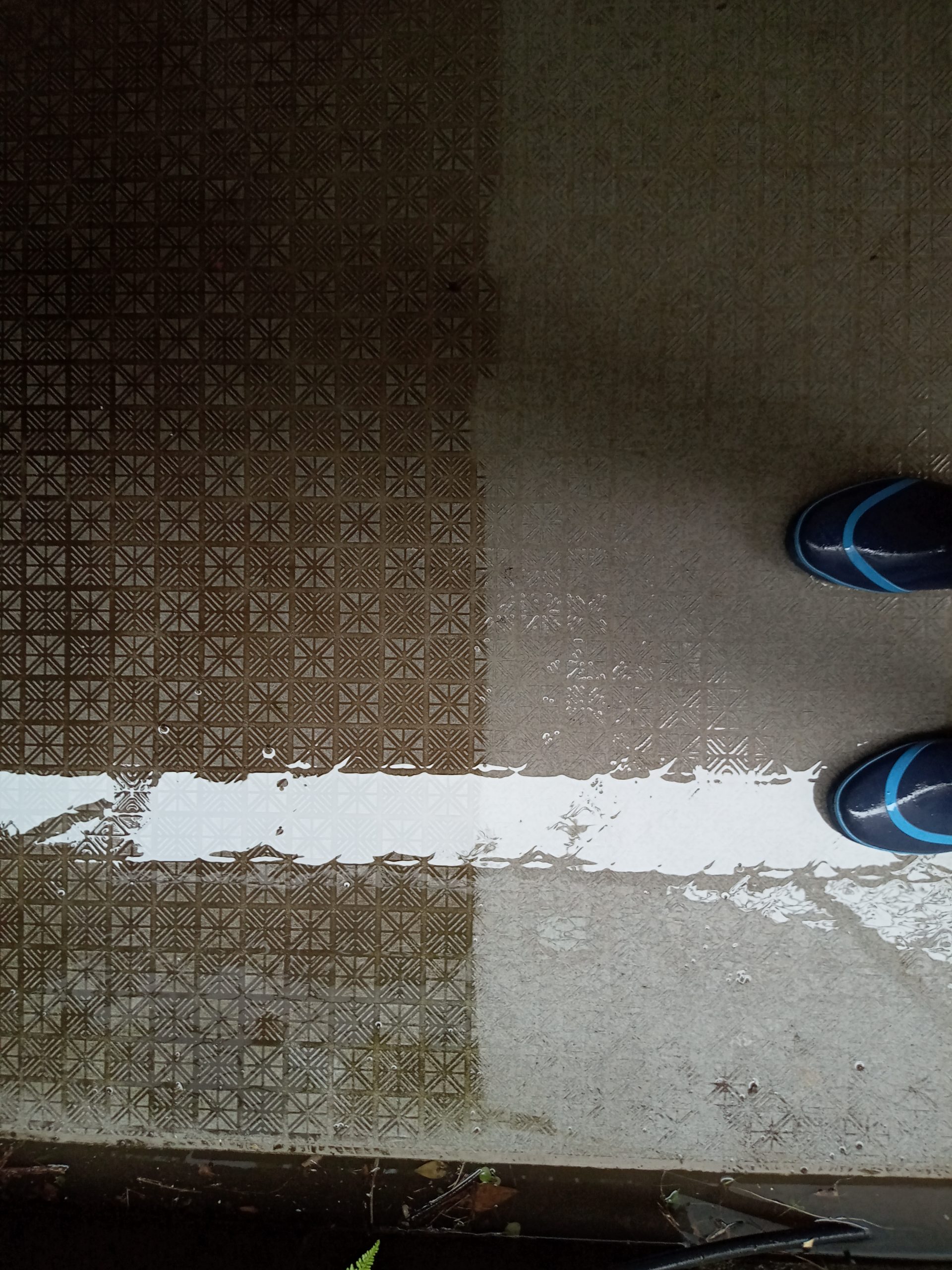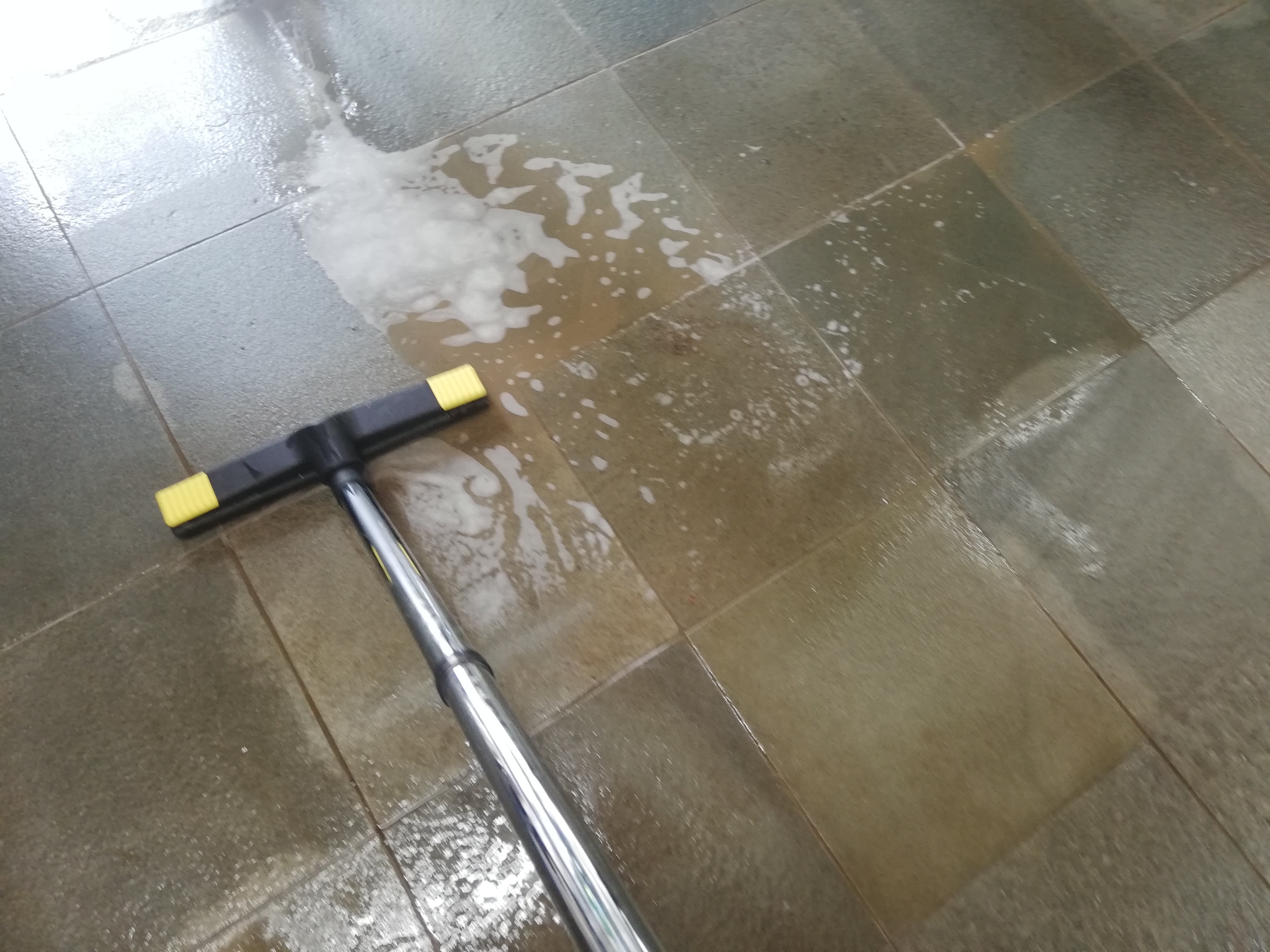 写真は磁器タイル清掃エリアの汚水回収をしているときの様子です。広い空間だったので、カッパギで汚水を中央に小さくまとめておいてバキュームで一気に吸い取ります。