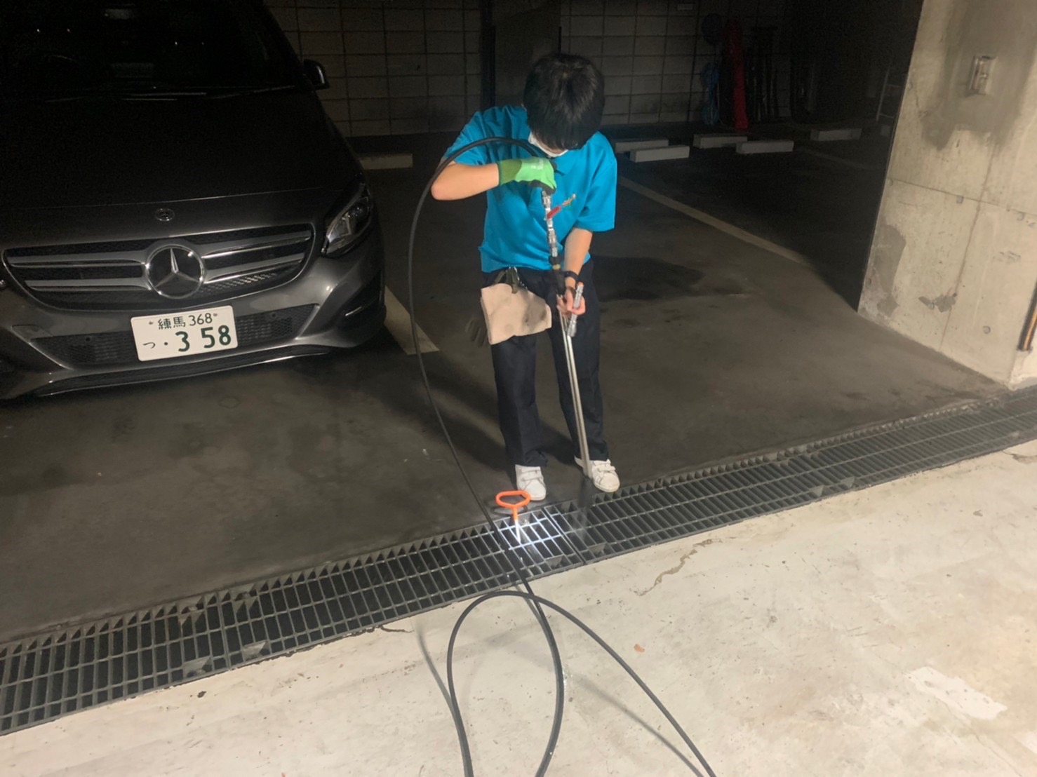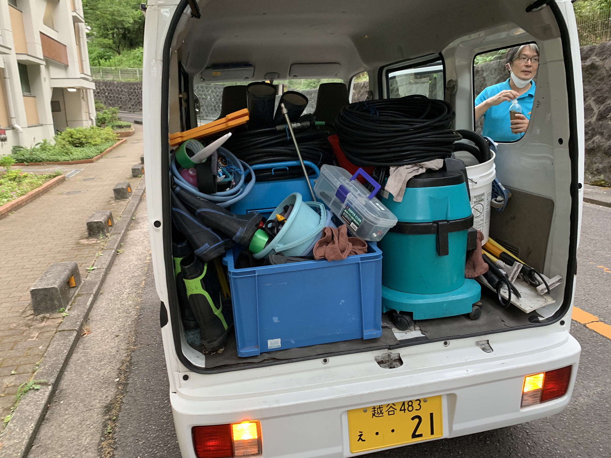 写真は軽の作業車ですが、大型現場ということもあり高圧洗浄機のホースがこれでもかという程積んでありました、!