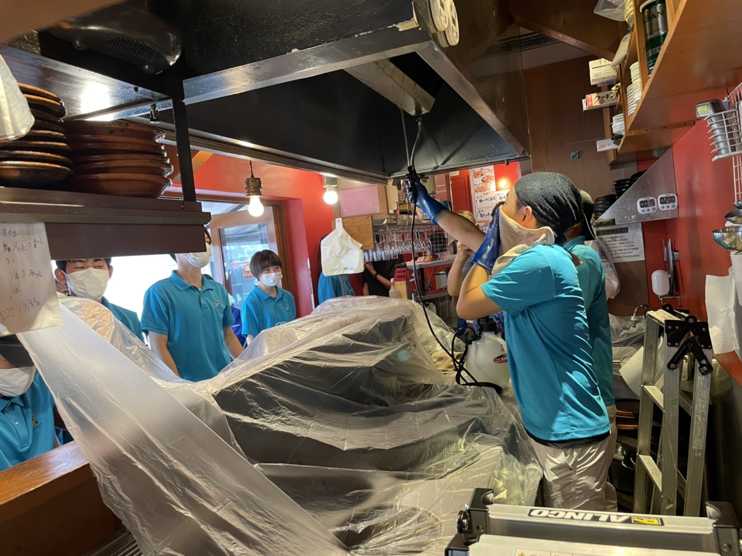 本日は、厨房清掃で実際の現場に行ってきました。時間の関係で全部はできませんでしたが、レンジフードやグリスフィルターなどの油汚れが多いものをやりました。苛性ソーダでつけ置きをしても落ちきらないものや二度漬けをして落としたものもありました。臭いがきつかったりぬるぬるしたりとありますが、厨房清掃頑張りたいと思います!