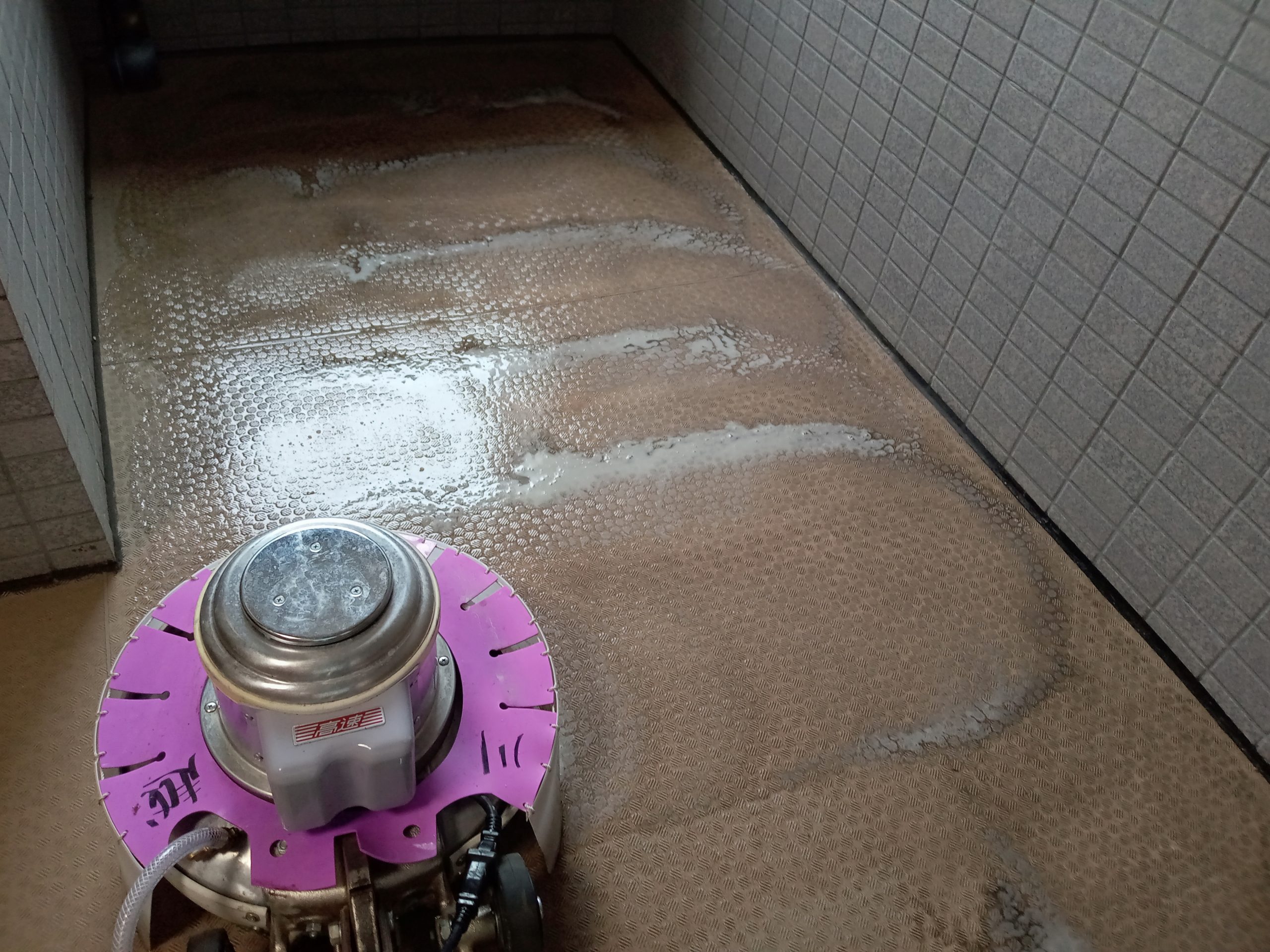 今までは共有部洗浄というと高圧洗浄機を使って対応させていただく現場に行っておりましたが、今回はポリッシャーによる洗浄を行う初めての現場でした。