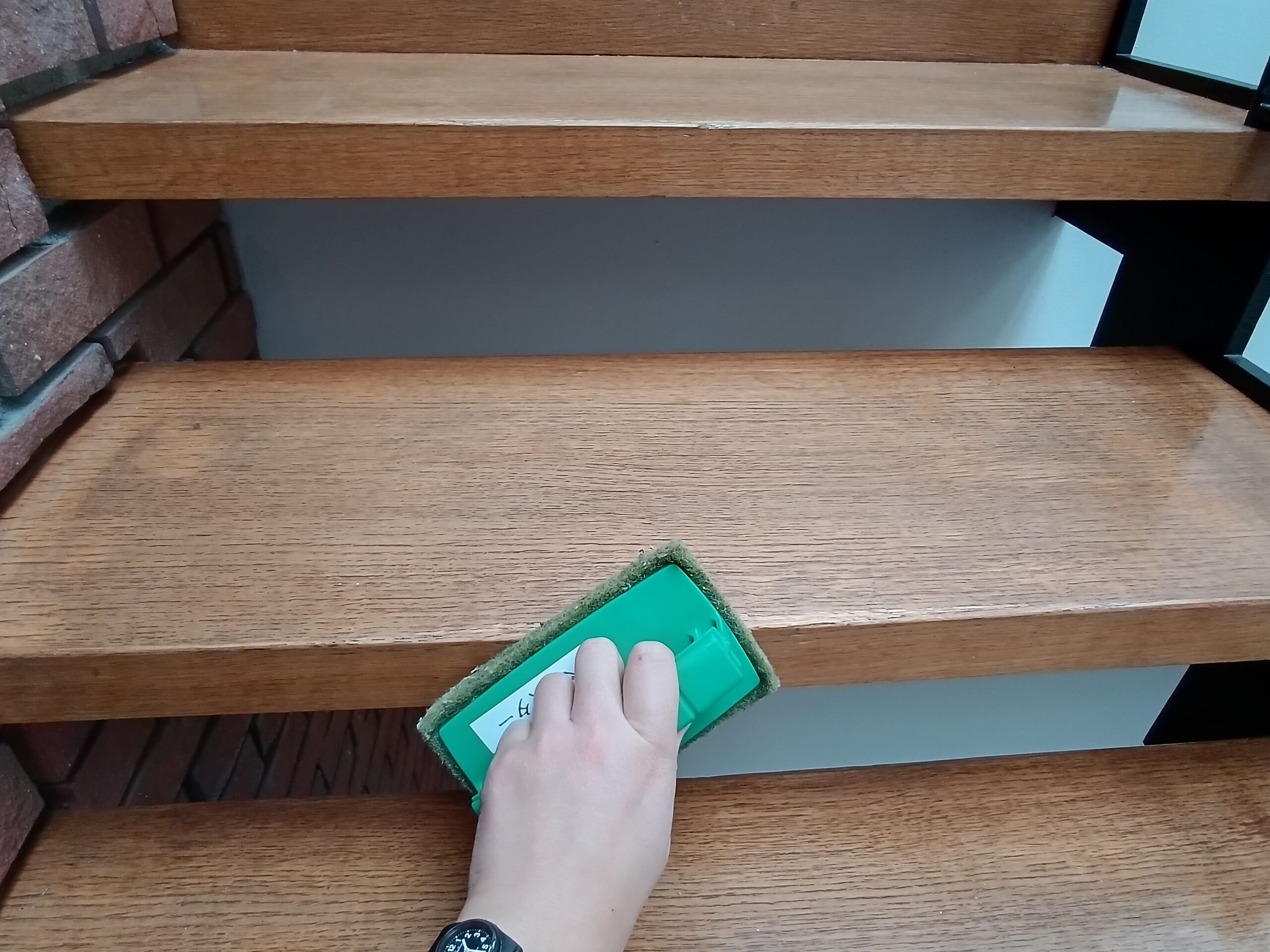 ワックスを綺麗に塗る為、階段を一段一段丁寧に磨きました!