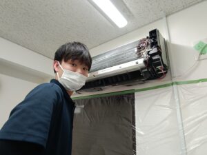 先日、チームで事務所のエアコンを使って分解清掃を行いました!