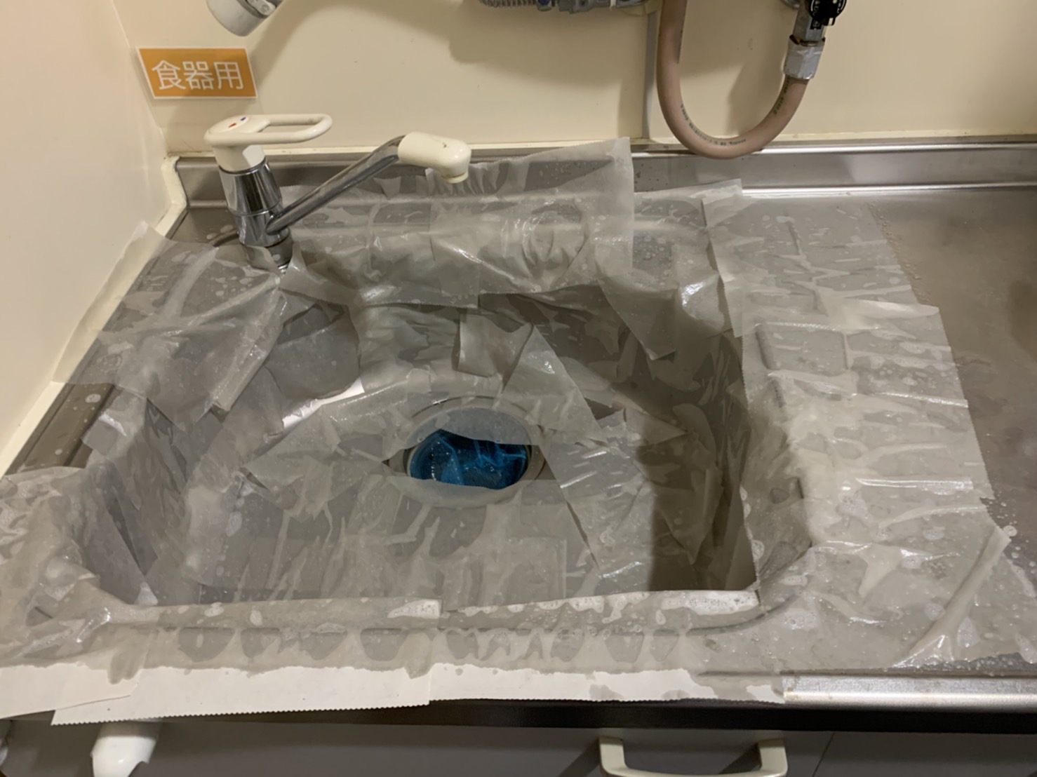 こちらの養生の仕方は、ミスターさんに教えて頂きました。このようにすることで、作業中に水が漏れてしまった際に、すぐに気が付いて対処することができるのだと思いました。