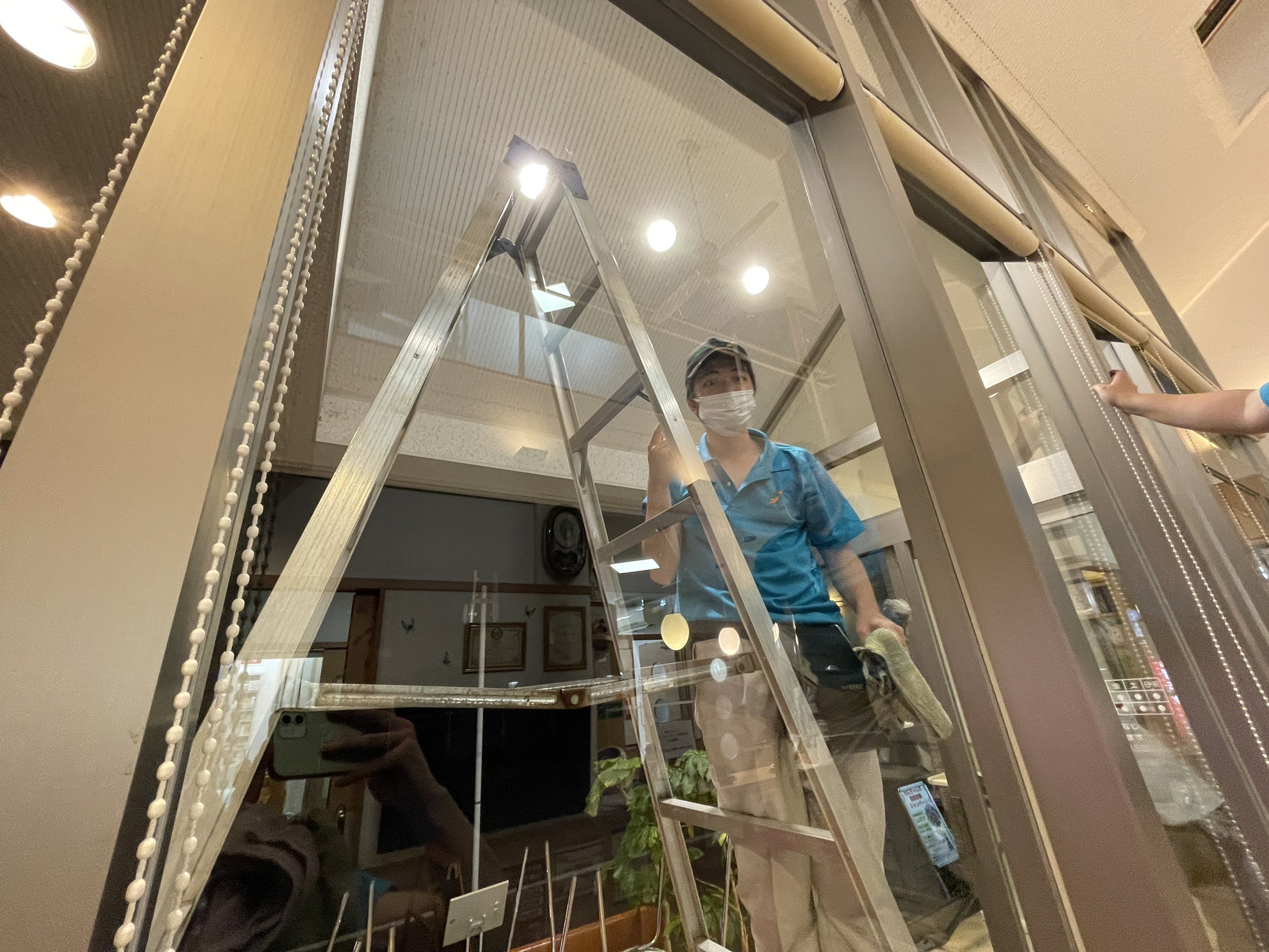 10脚の脚立を使ってガラスの清掃を行いました!脚立の上ではバランスが取りづらいため、はしの方まで綺麗にするのが大変でした!