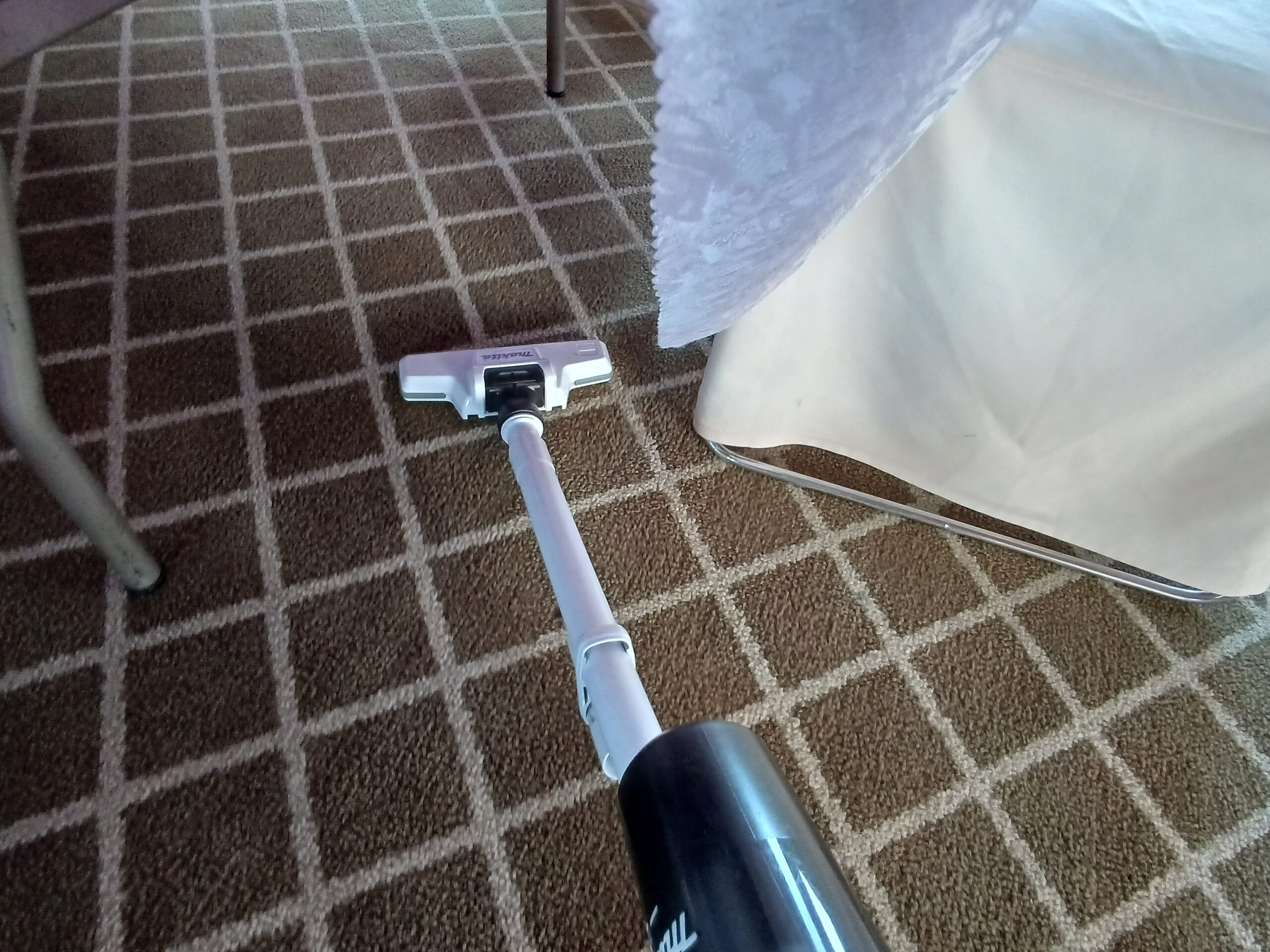 テーブルの下はテーブルクロスの中もしっかり確認して掃除機をかけます。