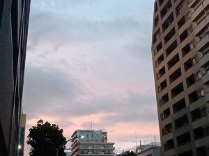 今日はビルの合間から見えた夕焼けの余韻の桃色と、夜が近づく淡い紺色の合わさった夕暮れ空が綺麗でした!