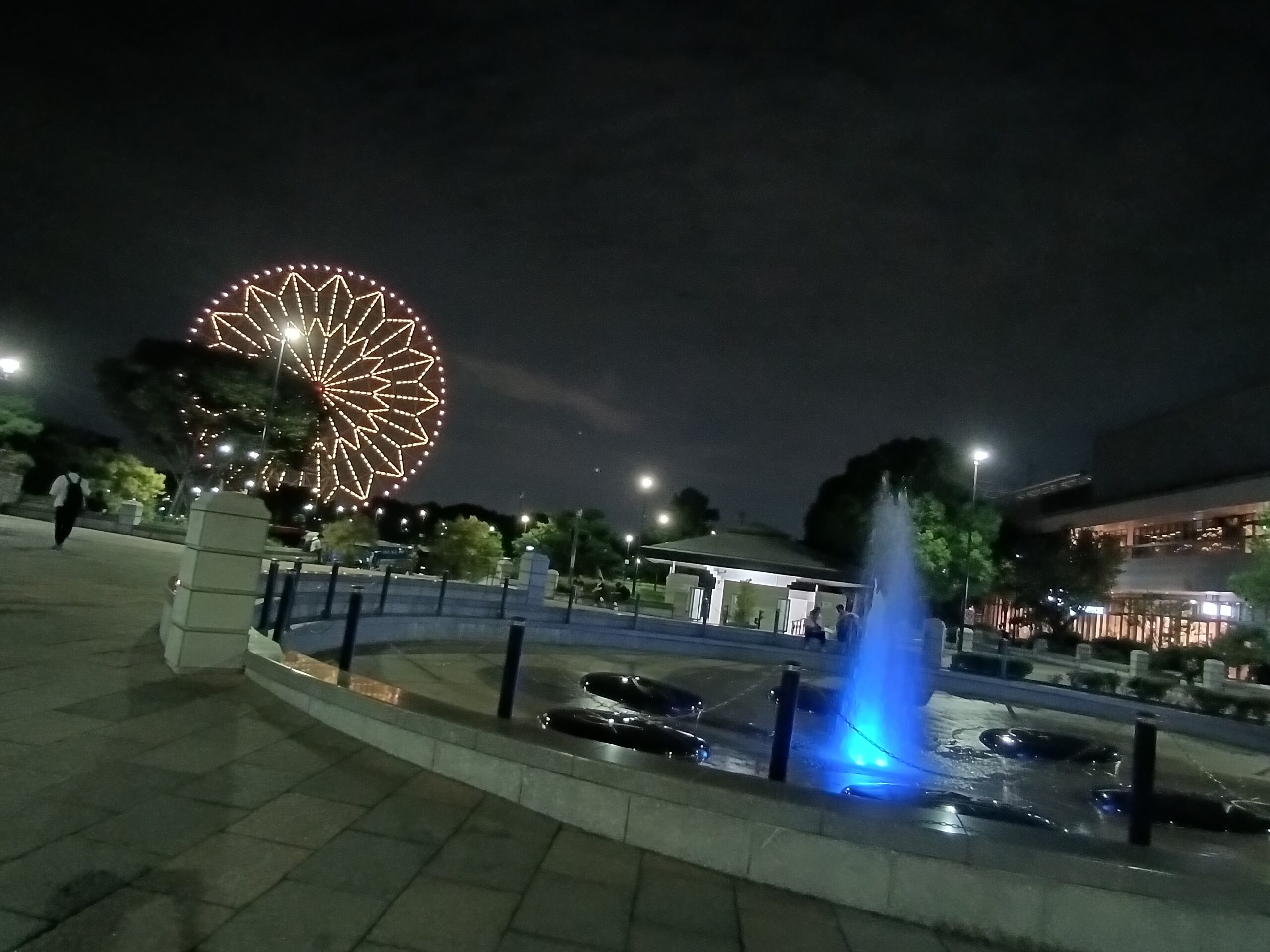 帰り道に噴水と観覧車のライトアップを見て思わず写真を1枚。