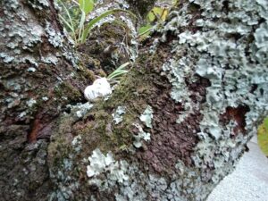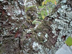 作業中にふと木を見ると、幹の間に挟まれたゴミが⋯。