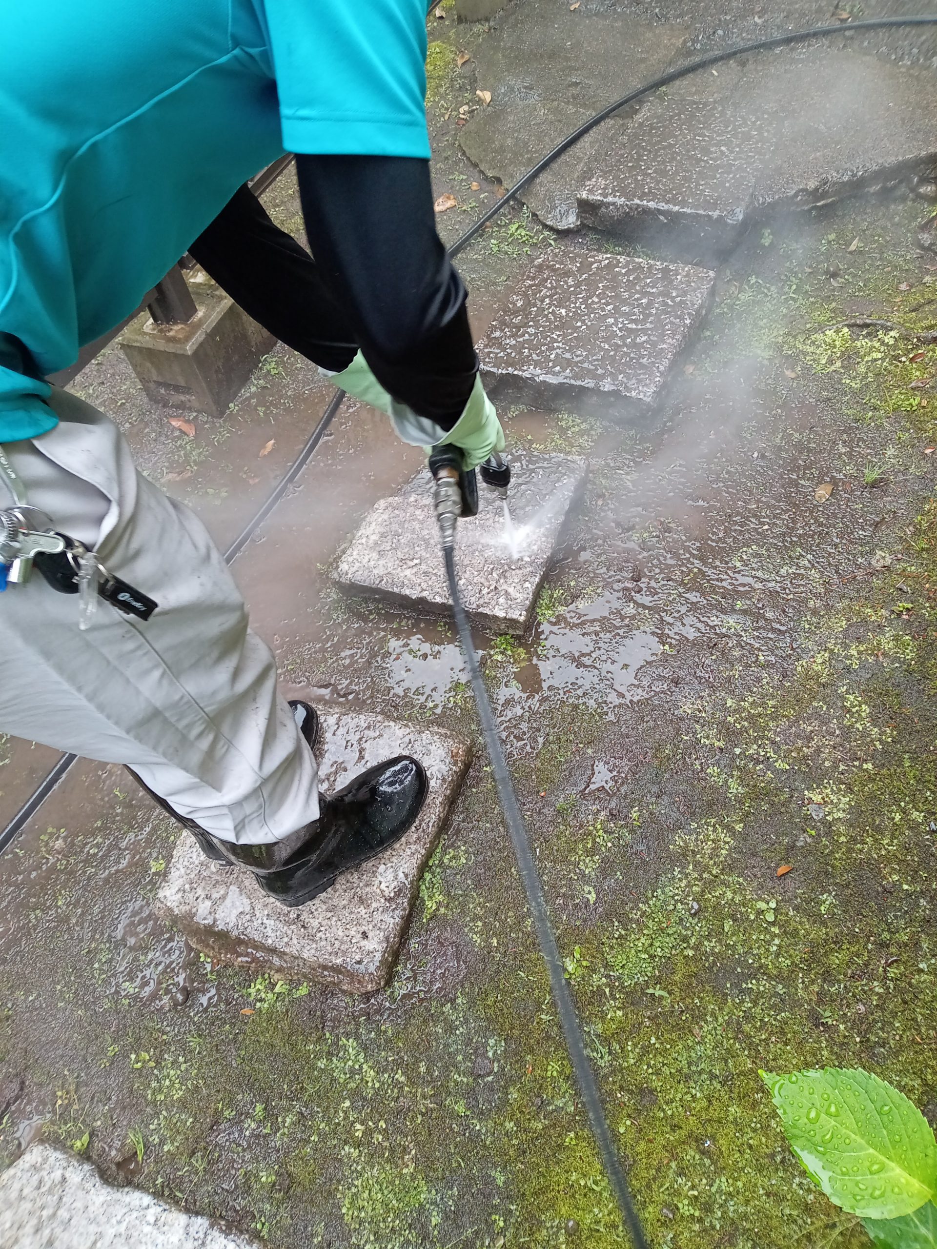 何時もはマンションの廊下などの半室内が多いのですが、今日は外の飛び石まで清掃しました!苔や固まった泥などが取れてまるで別の石材みたいになりました……雨と高圧の水跳ねで濡れたので帰って即シャワー浴びました