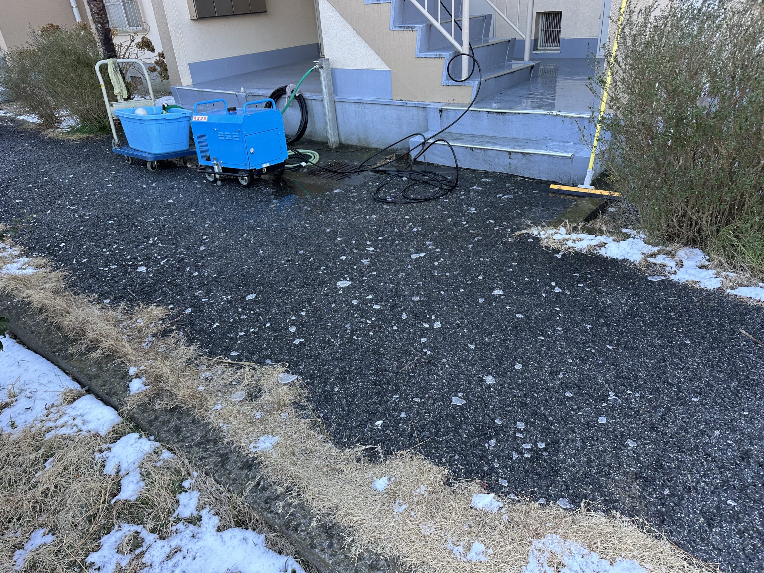 先日、雪が降った次の日に高圧洗浄をしてきました!所々凍っていたので氷がいっぱい飛びました!